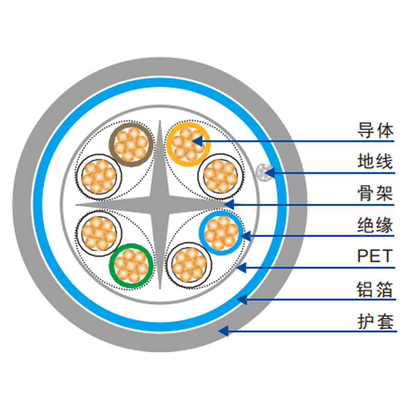 产品性能:导体直径23AWG,铜导体由7根细铜丝组成,屏蔽RJ45水晶头,采用十字骨架、总屏蔽结构;满足并优于六类传输系统标准的要求,具有防止松动、自锁、插拔灵活的功能,接点镀金厚度为50μ(inch),插拔寿命>1000次,可以与5类和超5类产品兼容;